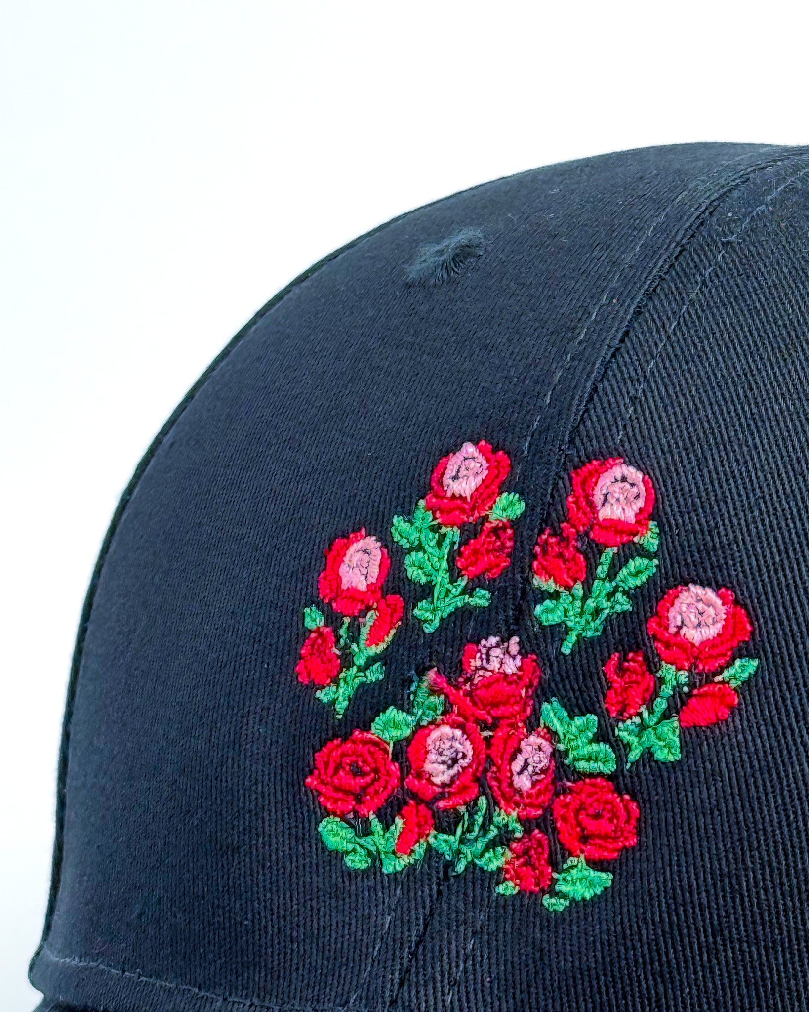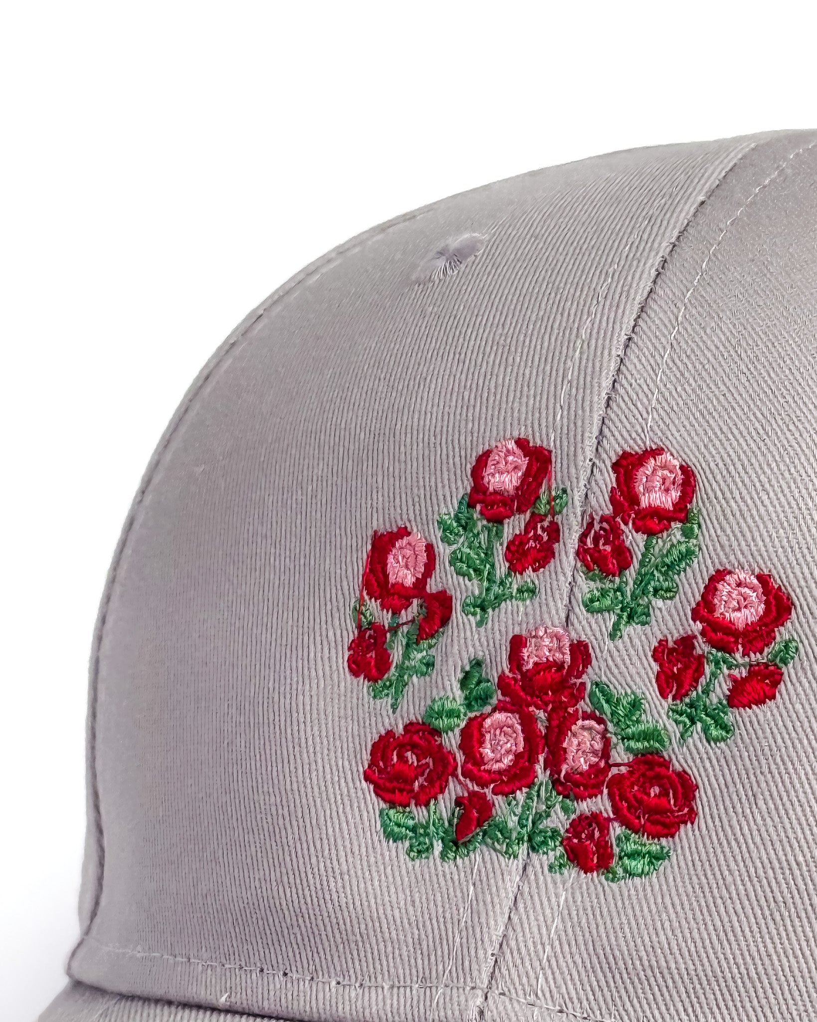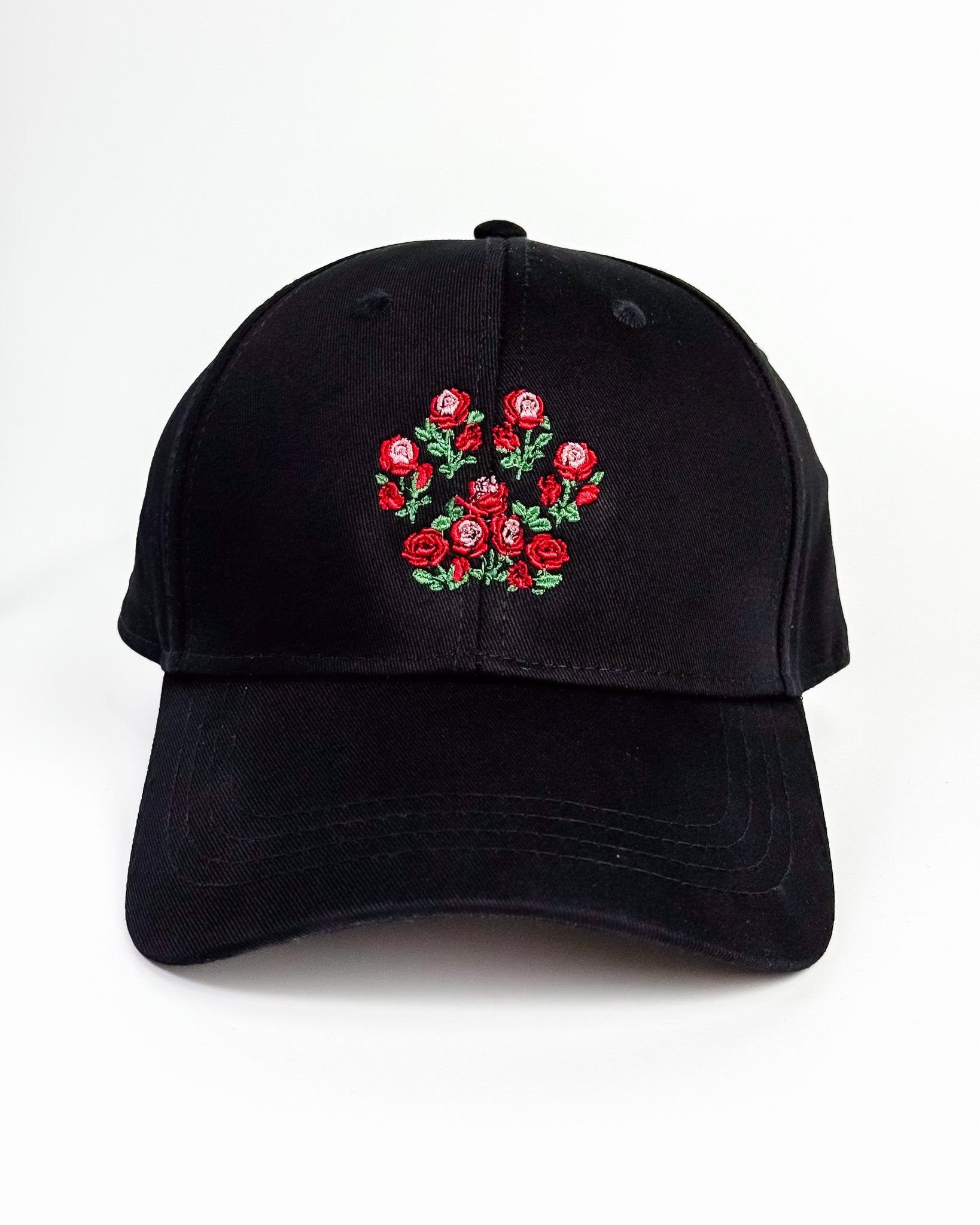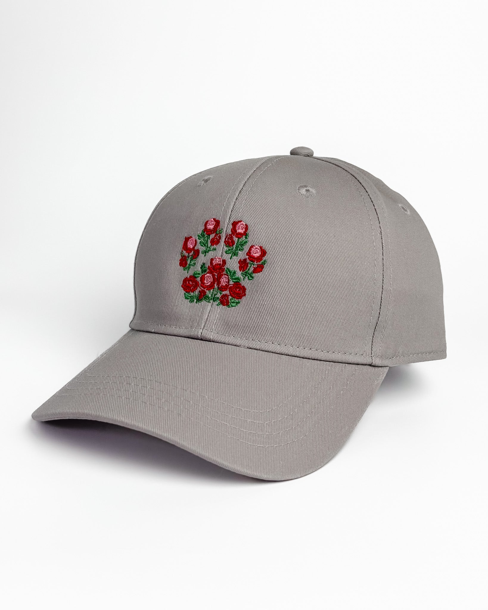 A soft structured cap adorned with delicately embroidered rose-paw designs.
